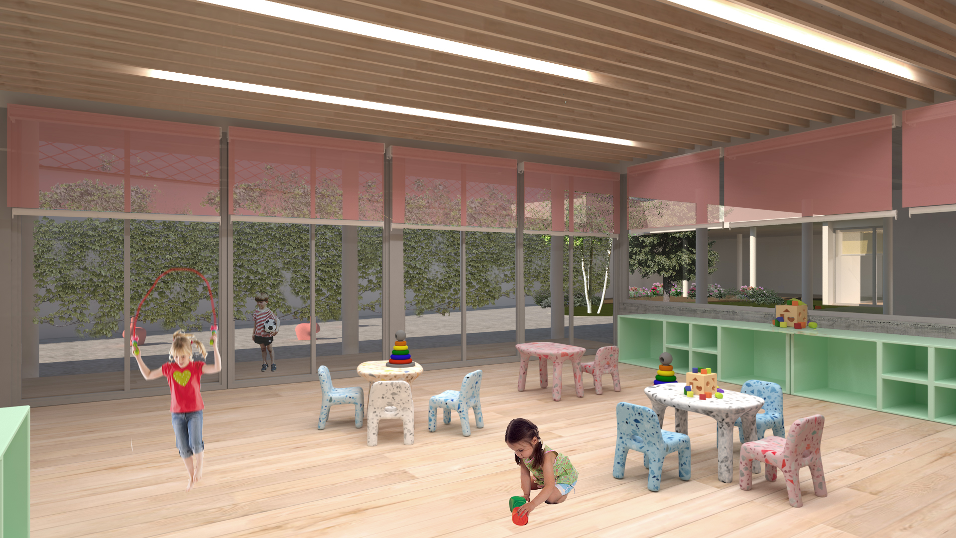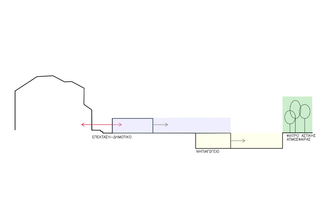 βασικό μέλημα είναι η διασφάλιση ενός αυτόνομου κτιρίου με δυνατότητα όσο μεγαλύτερου αύλειου χώρου προσαρμοσμένου στις ανάγκες των νηπιών. για αυτό το σκοπό επιλέγεται η τοποθέτηση του νηπιαγωγείου σε υπόγεια στάθμη με την δημιουργία ενός μεγάλου αιθρίου.