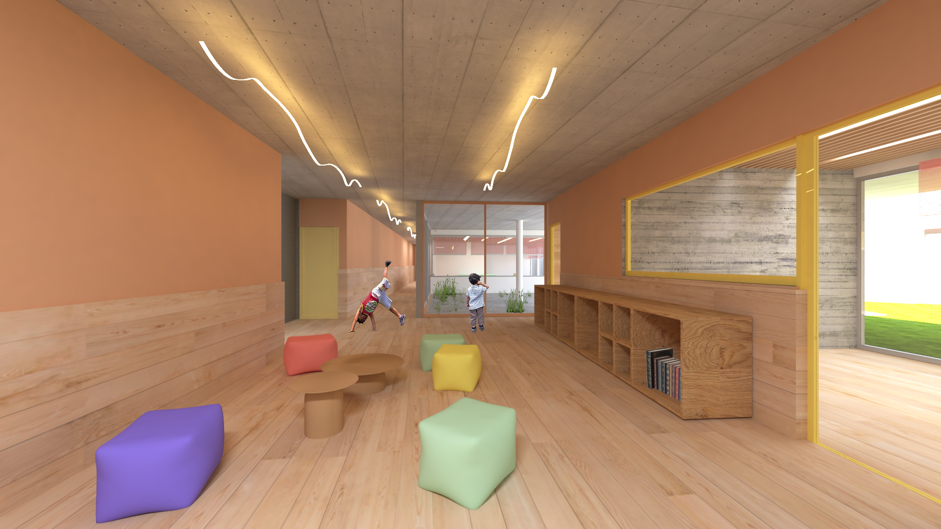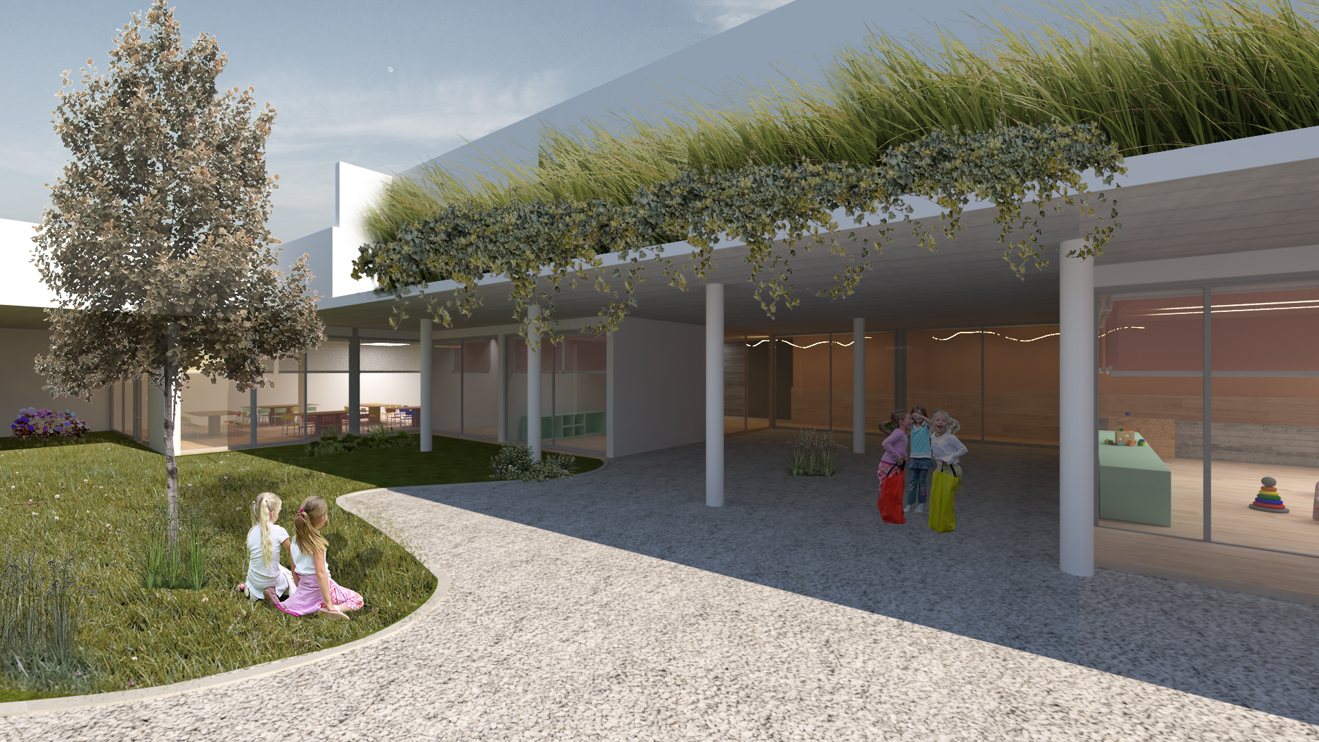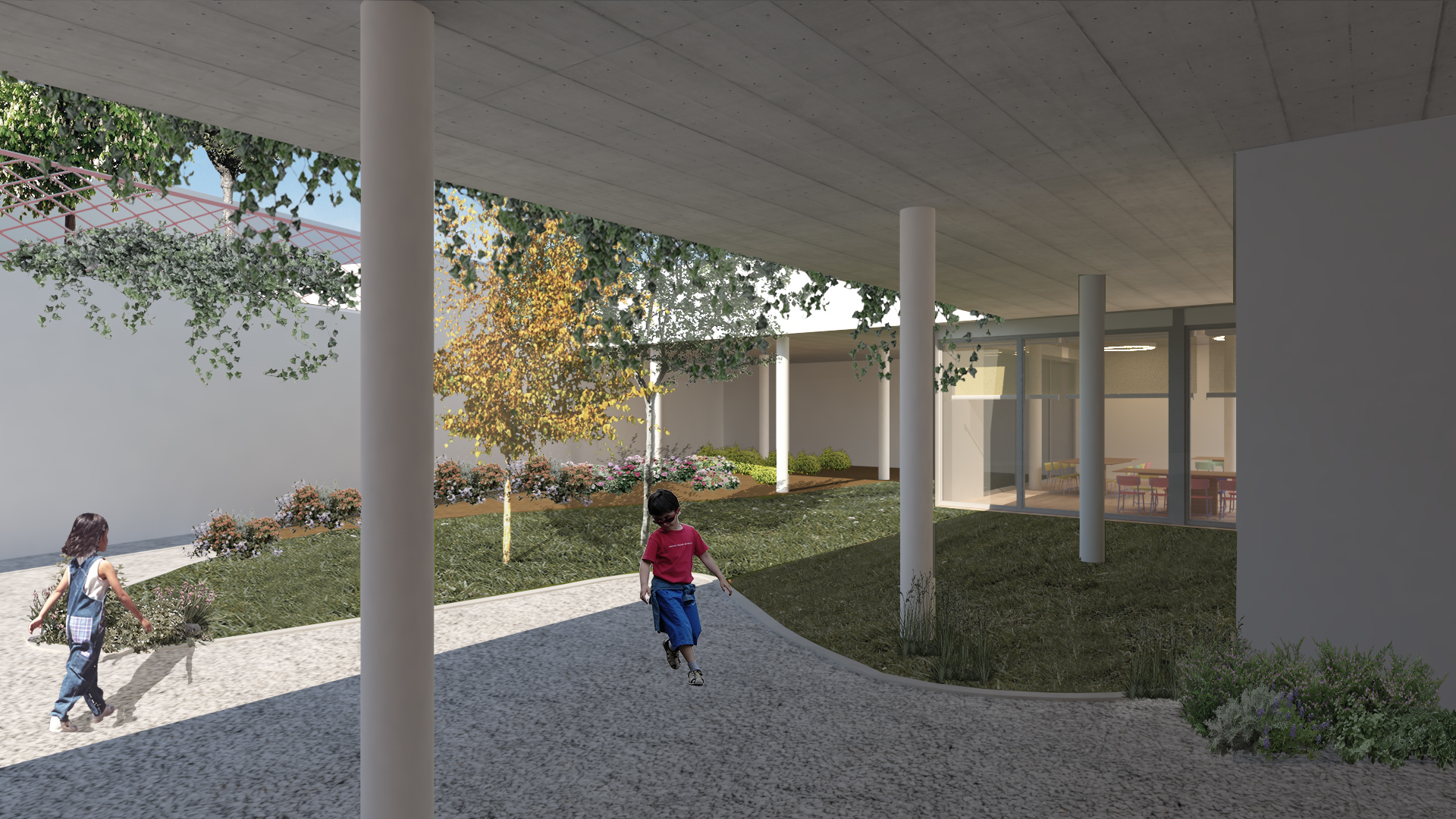 Η νέα πτέρυγα του δημοτικού σχολείου τοποθετείται σε κοντινή απόσταση με το υφιστάμενο κτίριο ενισχύοντας την αρμονική σύνδεσή τους. οι ημιυπαίθριοι χώροι και οι στοές του προτεινόμενου κτιρίου αποτελούν ζωτικούς χώρους όπου οι μαθητές μπορούν να συναναστρέφονται έχοντας μια αίσθηση ενοποίησης του νέου κτιρίου με το υφιστάμενο.