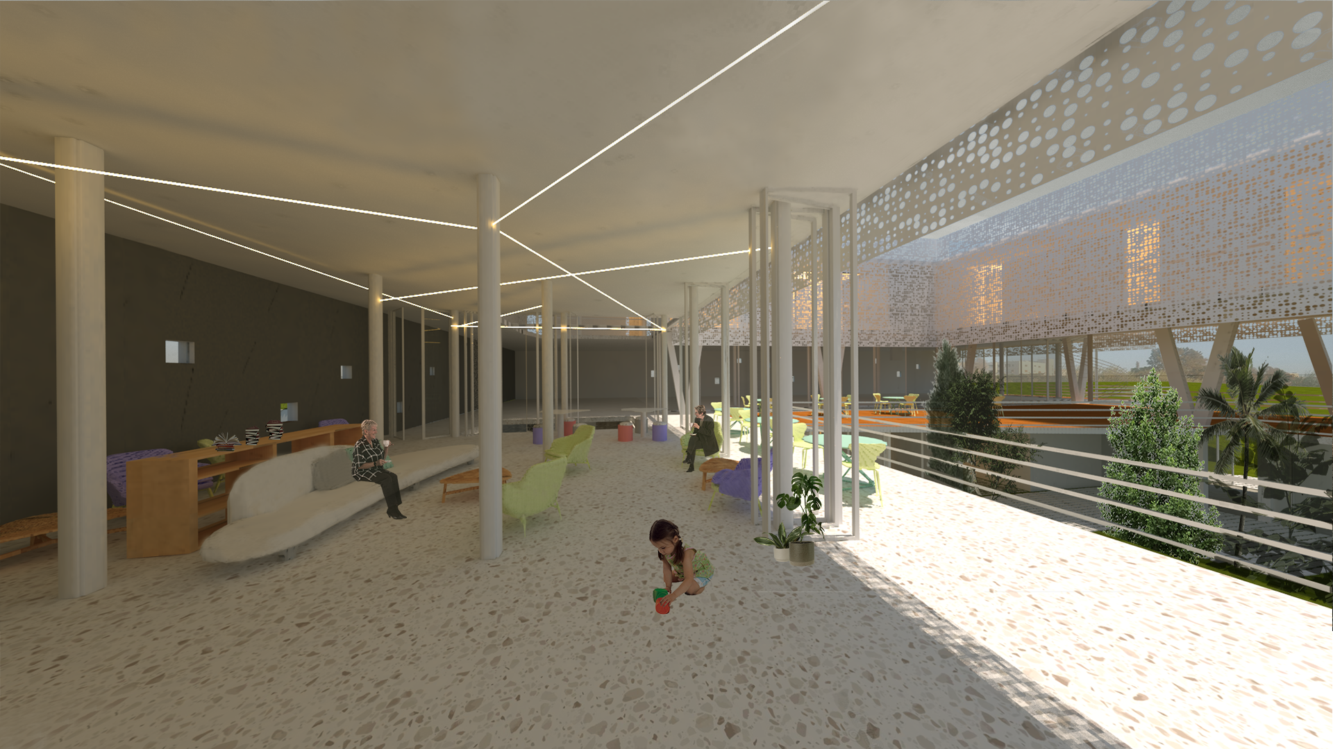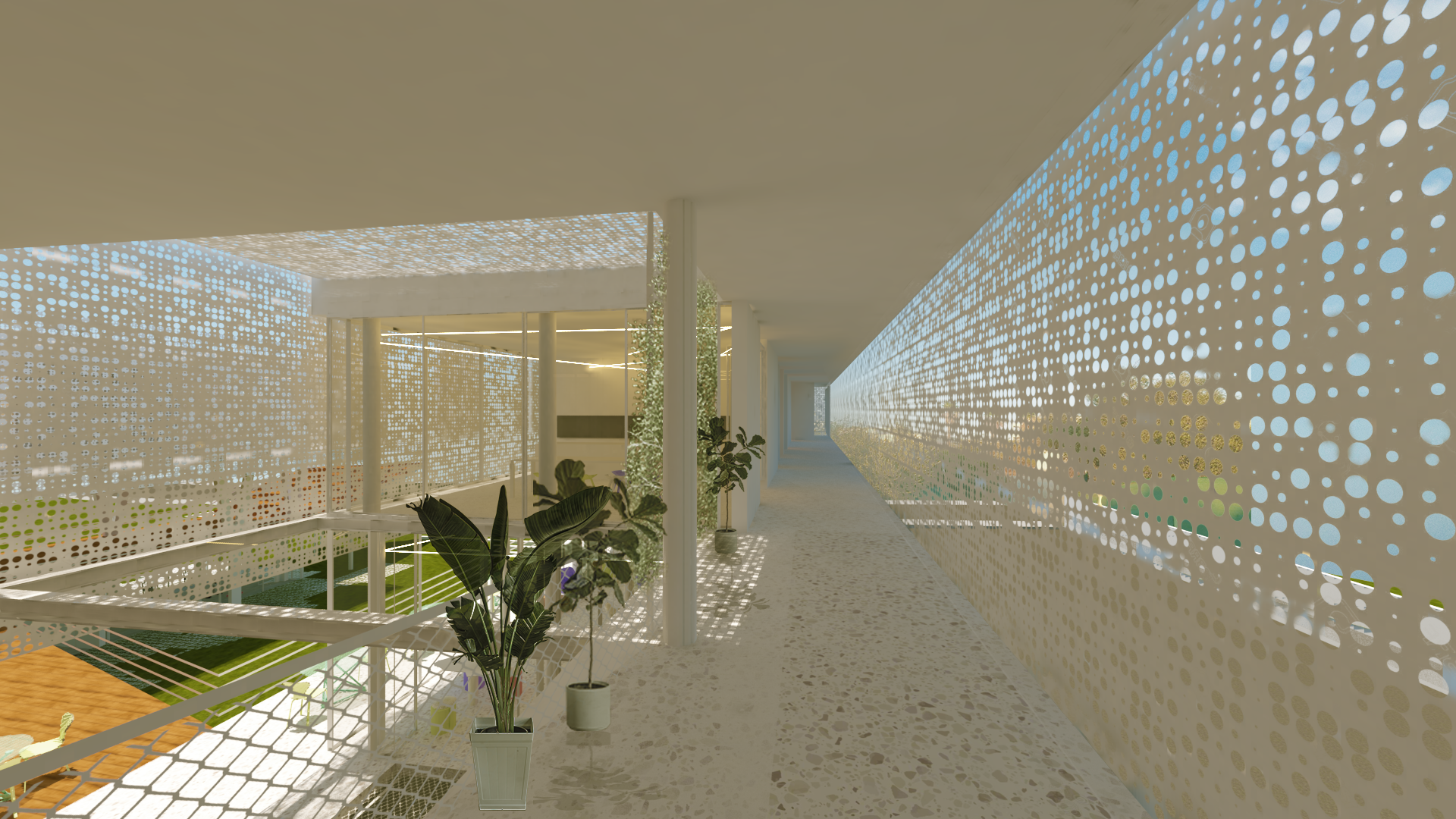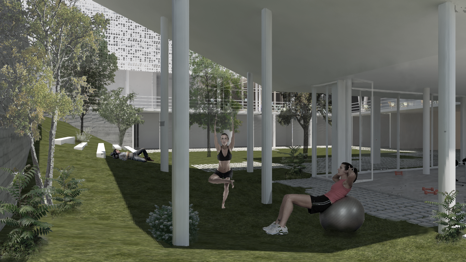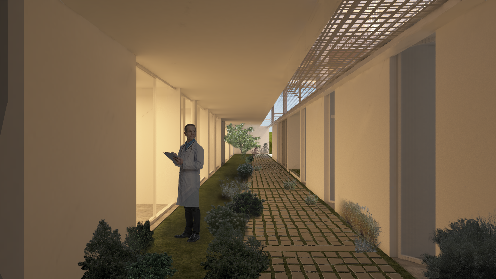 Στην στάθμη ισογείου δημιουργείται μια εσωστρεφής εσωτερική αυλή όπου εκτονώνονται οι χώροι αποκατάστασης και ημερήσιας νοσηλείας, πετυχαίνοντας την ελαχιστοποίηση του θορύβου από τον δημόσιο δρόμο και δημιουργώντας κατάλληλες συνθήκες για ηρεμία και αίσθηση ασφάλειας στους ασθενείς.