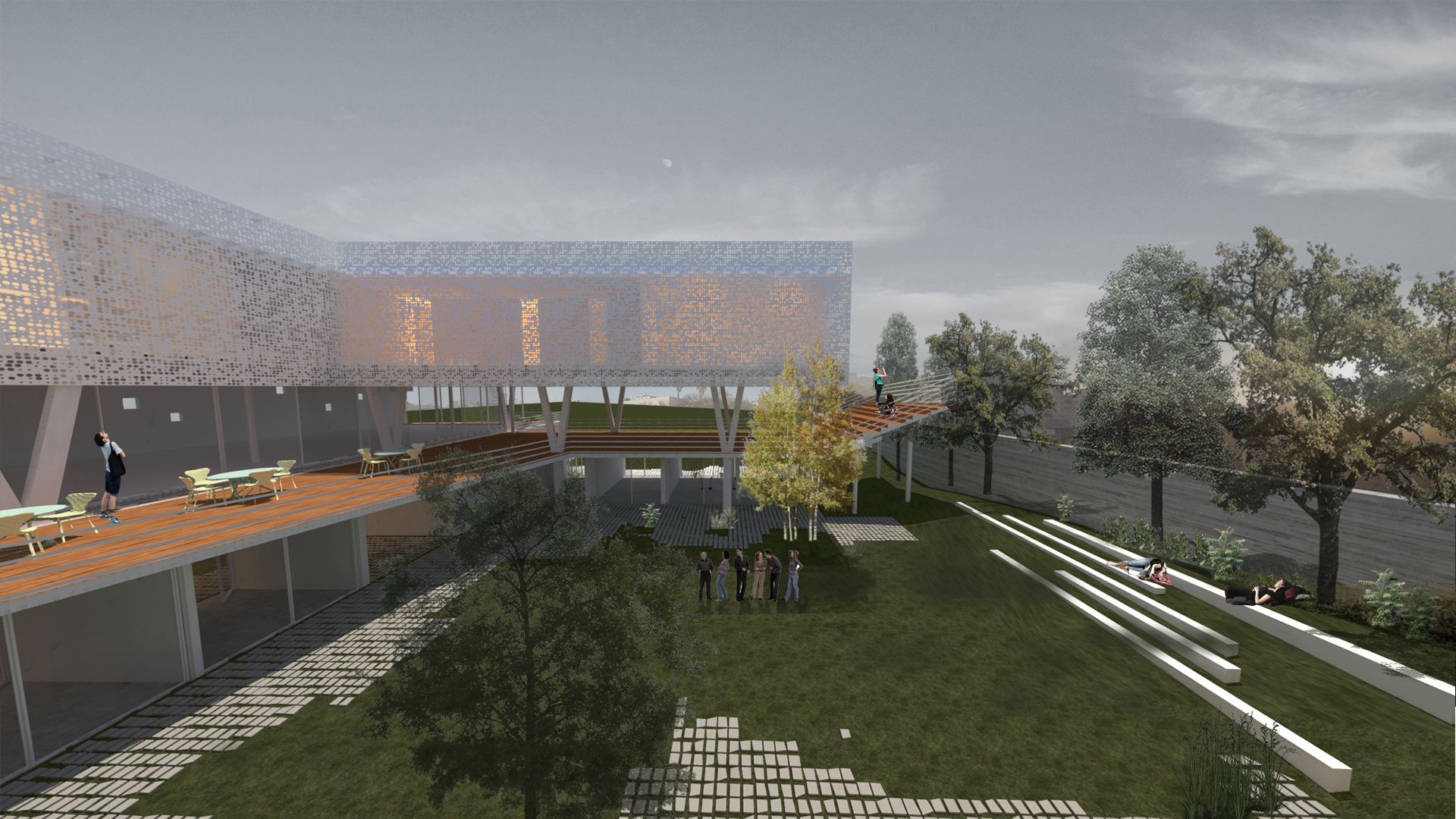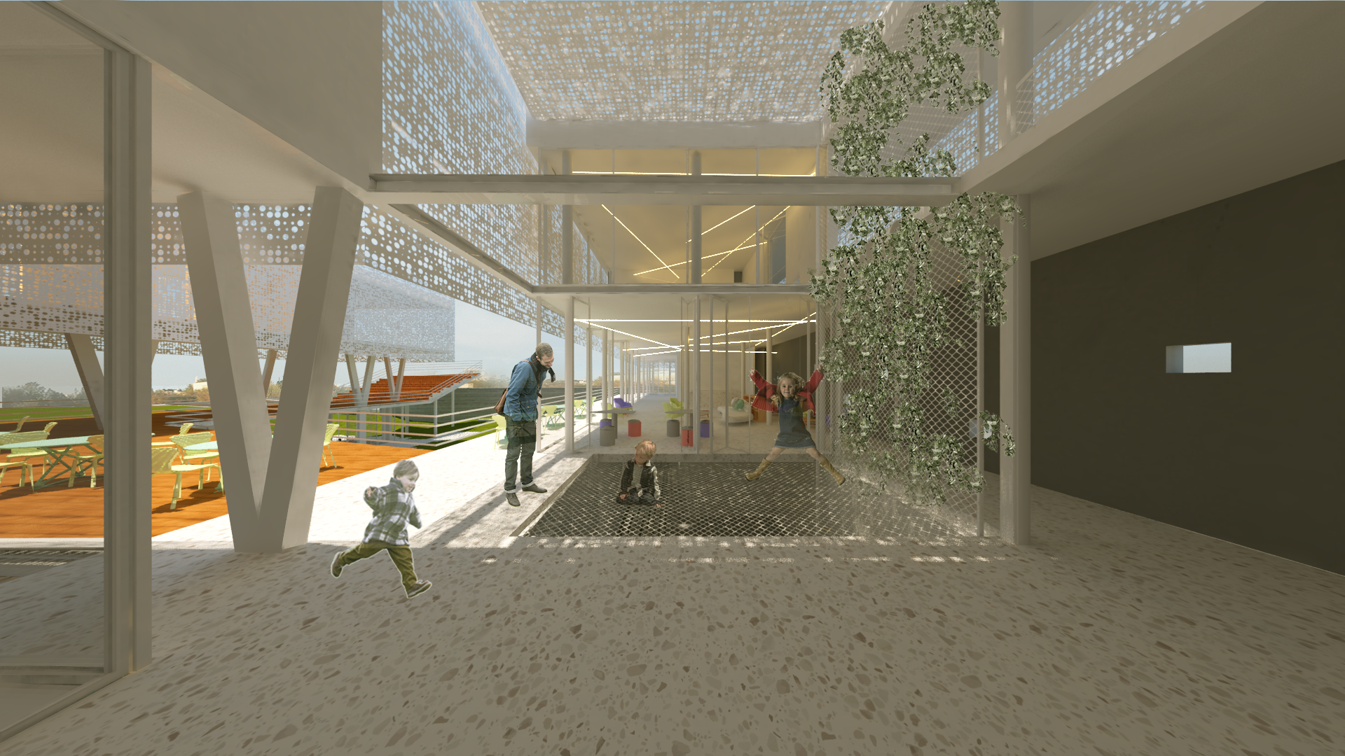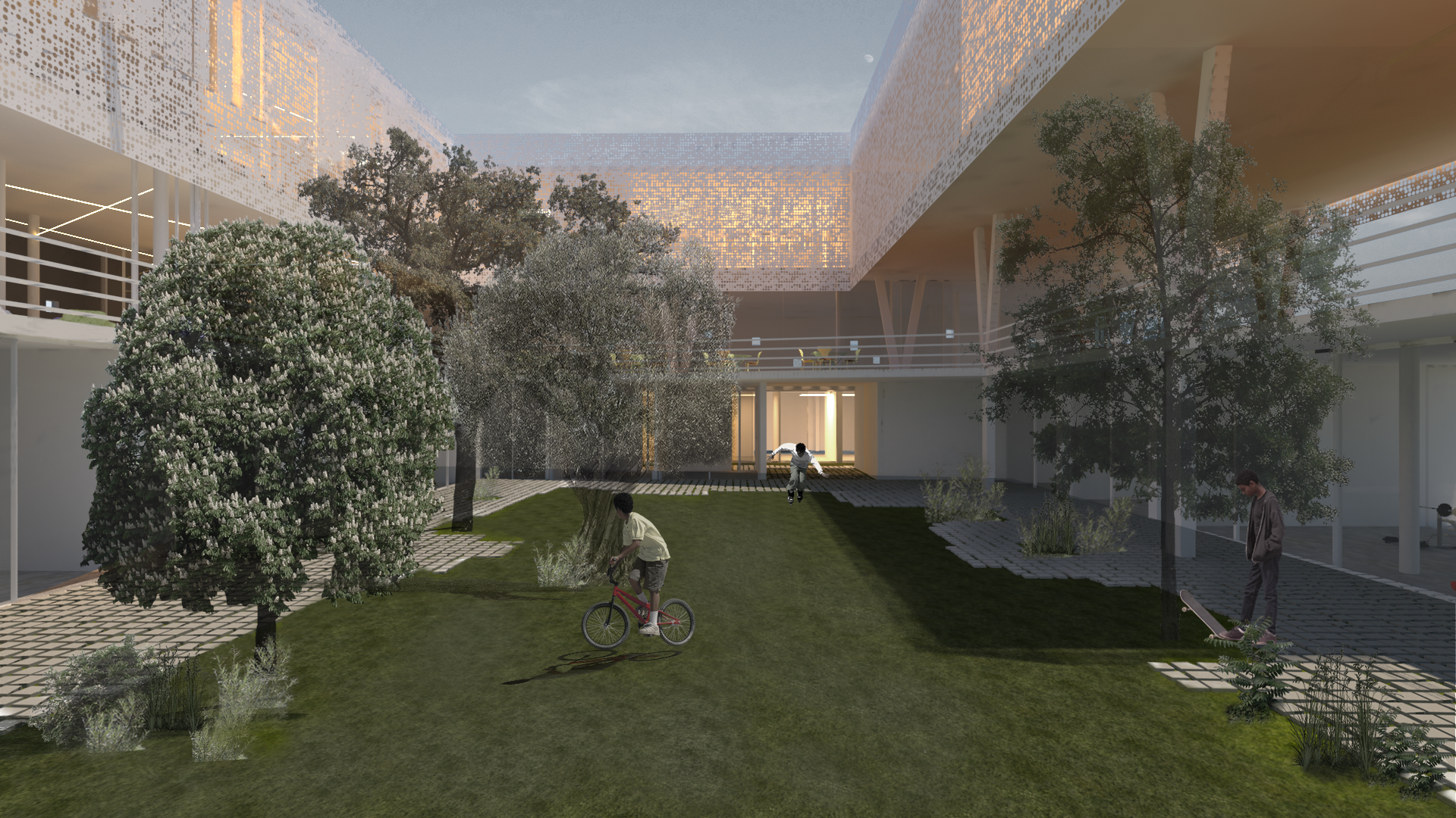 Η κεντρική αυλή στην στάθμη ισογείου αποτελεί την ‘’καρδιά΄΄ του Κέντρου και είναι ένας χώρο ζωτικής σημασίας για την εκτόνωση, την κοινωνική συναναστροφή, την ξεκούραση και την σωματική άσκηση των επισκεπτών. Στον πρώτο όροφο ο οποίος είναι οπτικά ΄΄ανοιχτός’’ προς το δρόμο τοποθετούνται ο χώρος υποδοχής/ καφετέριας και το εκπαιδευτικό κέντρο ενισχύοντας τον ‘’δημόσιο’’ χαρακτήρα τους.