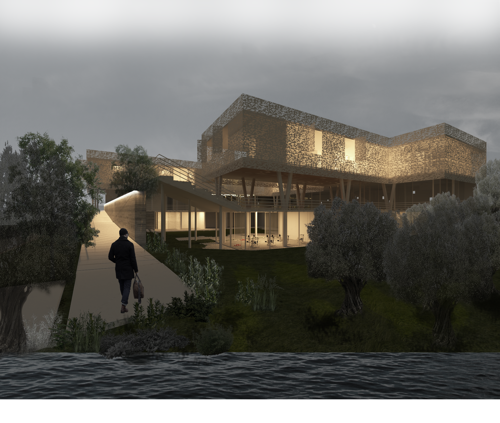 Βασική πρόθεση είναι η καλύτερη δυνατή αξιοποίηση της μορφολογίας του εδάφους και των έντονων κλίσεων με τέτοιο τρόπο ώστε να δημιουργείται μια συνεχής ροή.Η αξιοποίηση των κλίσεων του γηπέδου επιτρέπει την δημιουργία ομαλών πρανών και ενισχύει την ένταξη του υφιστάμενου ελαιώνα στη σύνθεση. Το φυσικό έδαφος διαμορφώνεται σε δύο επίπεδα , στη στάθμη ισογείου και στην στάθμη του πρώτου ορόφου.