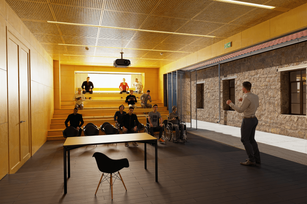 Η αίθουσα διαλέξεων έχει σχεδιαστεί με ευελιξία, προκειμένου να υποστηρίξει ποικίλες λειτουργίες και εκδηλώσεις, προσαρμοζόμενη στις ανάγκες της κοινότητας. Ο χώρος είναι ιδανικός για τη φιλοξενία σεμιναρίων, εκδηλώσεων και παρουσιάσεων που σχετίζονται με την επιχειρηματικότητα, την εκπαίδευση, αλλά και τον πολιτισμό της περιοχής. Η στρατηγική τοποθέτηση της αίθουσας στο ισόγειο διασφαλίζει την άμεση προσβασιμότητα από το κοινό, δημιουργώντας έναν ανοικτό χώρο αλληλεπίδρασης για τους κατοίκους της πόλης και τους επισκέπτες.