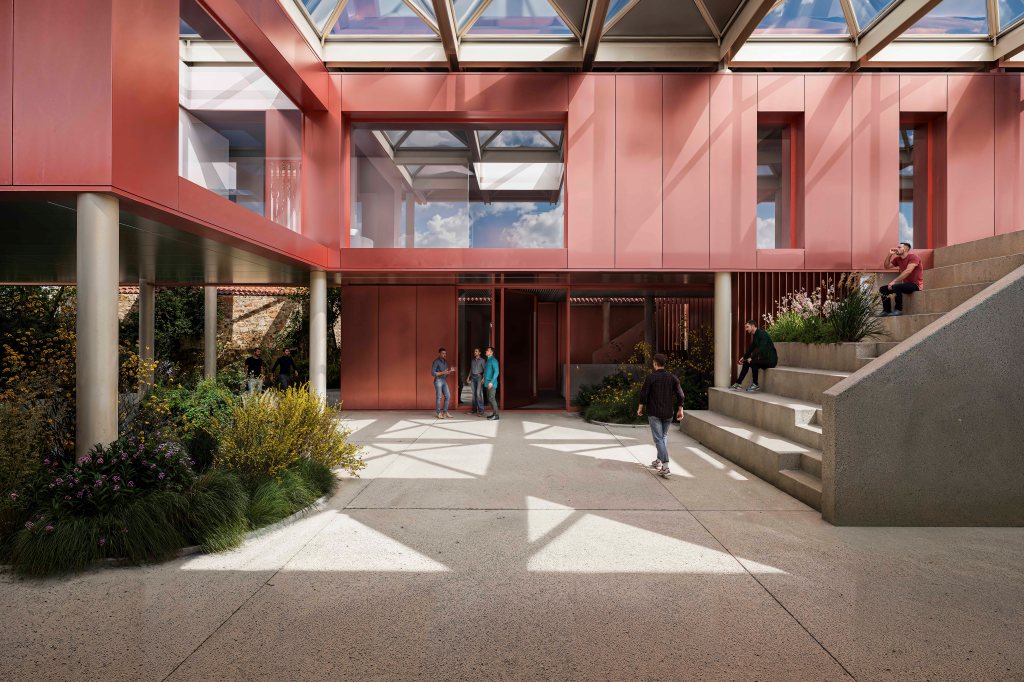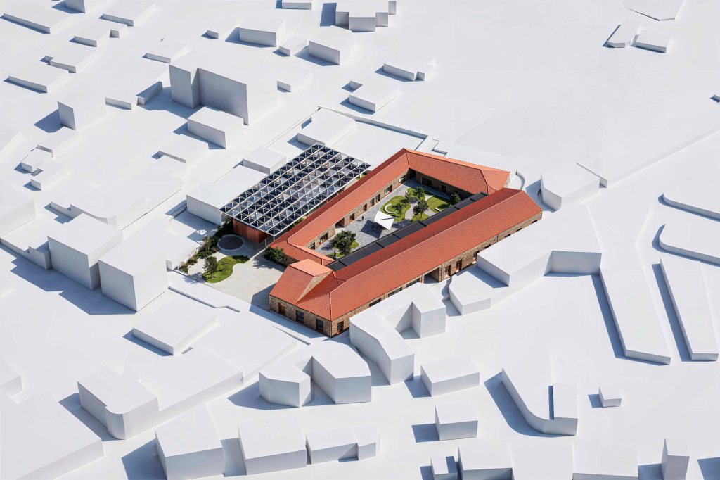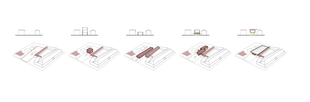 Το νέο Κέντρο Νεανικής Επιχειρηματικότητας έχει σχεδιαστεί έτσι ώστε να ακολουθεί την επιμήκη μορφή των διατηρητέων κτιρίων, δημιουργώντας έναν αρμονικό διάλογο μεταξύ παλαιού και νέου. Αυτή η μορφολογική συνέχεια επιτρέπει στο κτίριο να ενσωματωθεί ομαλά στον υφιστάμενο αστικό ιστό. Η μικρή μετατόπιση του ορόφου προς το διατηρητέο κτίριο ενισχύει αυτήν την αλληλεπίδραση, προσδίδοντας μια γλυκιά και ήρεμη σχέση μεταξύ των δύο αρχιτεκτονικών στοιχείων. Το κτίριο αποτελείται από ισόγειο και έναν όροφο, ώστε να διατηρηθεί η ισορροπία με τα ύψη των γειτονικών διατηρητέων κτιρίων, εξασφαλίζοντας ότι δεν θα κυριαρχήσει στο τοπίο αλλά θα ενταχθεί διακριτικά σε αυτό.