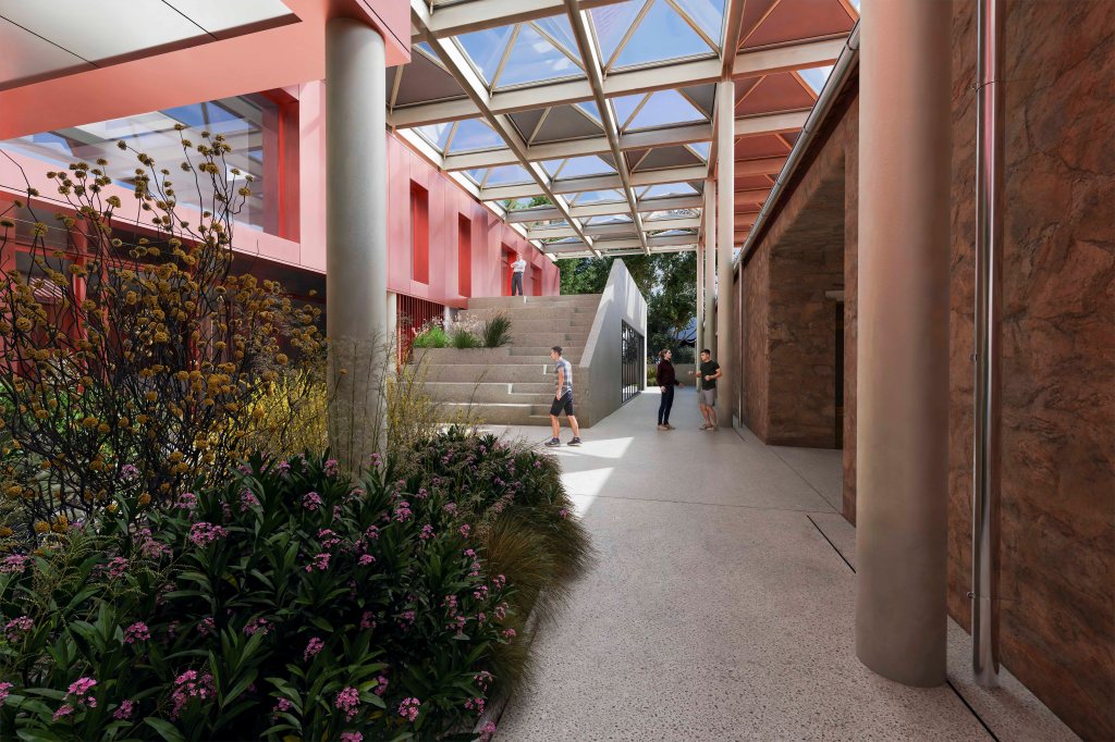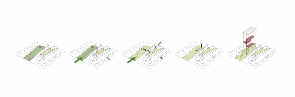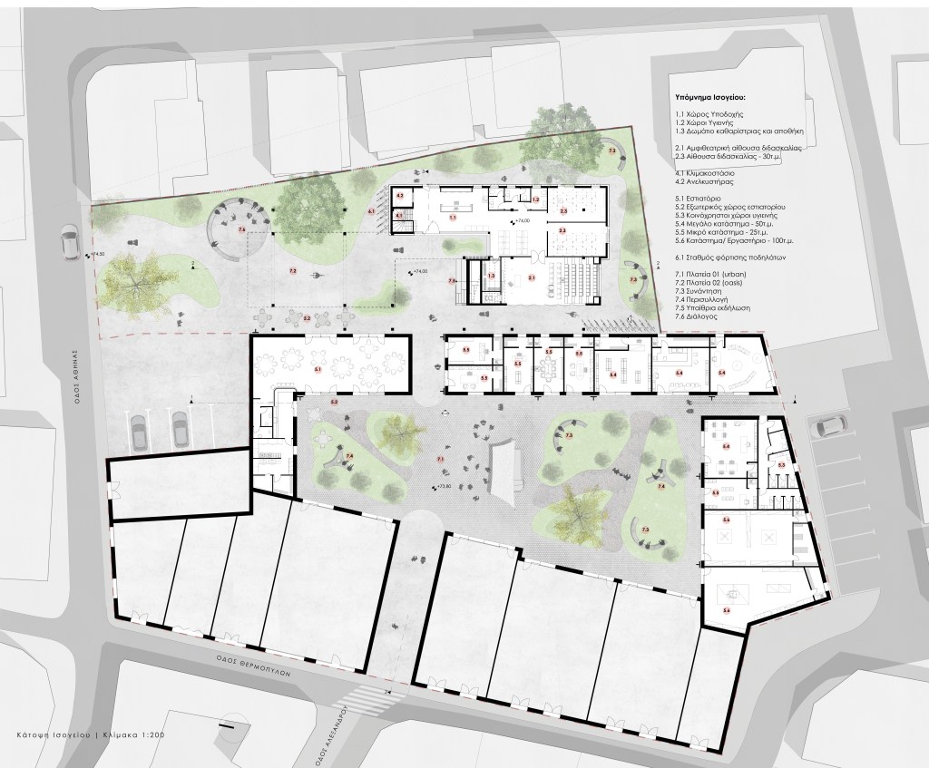 διαμορφώνεται μια μεγάλη ανοιχτή πλατεία, η οποία θα λειτουργήσει ως χώρος κοινωνικής αλληλεπίδρασης και αναψυχής. Η πλατεία αυτή, μαζί με την υπάρχουσα πλατεία που περικλείεται από τα διατηρητέα κτίρια, δημιουργεί δύο διακριτούς δημόσιους χώρους: η μία πλατεία (urban) θα έχει εμπορικό χαρακτήρα, φιλοξενώντας καταστήματα, εργαστήρια και εστιατόριο ενώ η άλλη πλατεία (oasis), που προτείνεται από το νέο κτίριο, θα μοιάζει με ένα πάρκο, προσφέροντας μια χαλαρωτική εμπειρία στους κατοίκους και επισκέπτες.